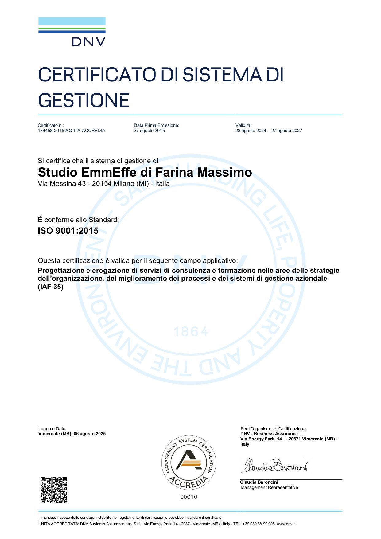 Lo Studio EmmEffe di Farina Massimo è dotato di un Sistema di Gestione per la Qualità certificato ISO 9001:2015, il cui campo di applicazione è:
